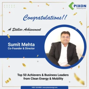 Last but not least, we are proud to share that our Director- Mr. Sumit Mehta, a pivotal figure in PIXON’s journey, has been honored as one of the Top 50 Achievers and Business Leaders in the clean energy and e-mobility sectors award by Smart Energy Magazine. This prestigious recognition is a testament to their relentless dedication to innovation and sustainability.