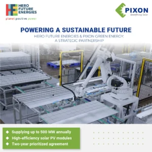 - In a significant move towards accelerating India’s renewable energy goals, PIXON has partnered with Hero Future Energies for supplying upto 500 MW annualy with high efficiency solar pv modules. This collaboration is set to bring innovative solar solutions to the forefront of the energy sector.